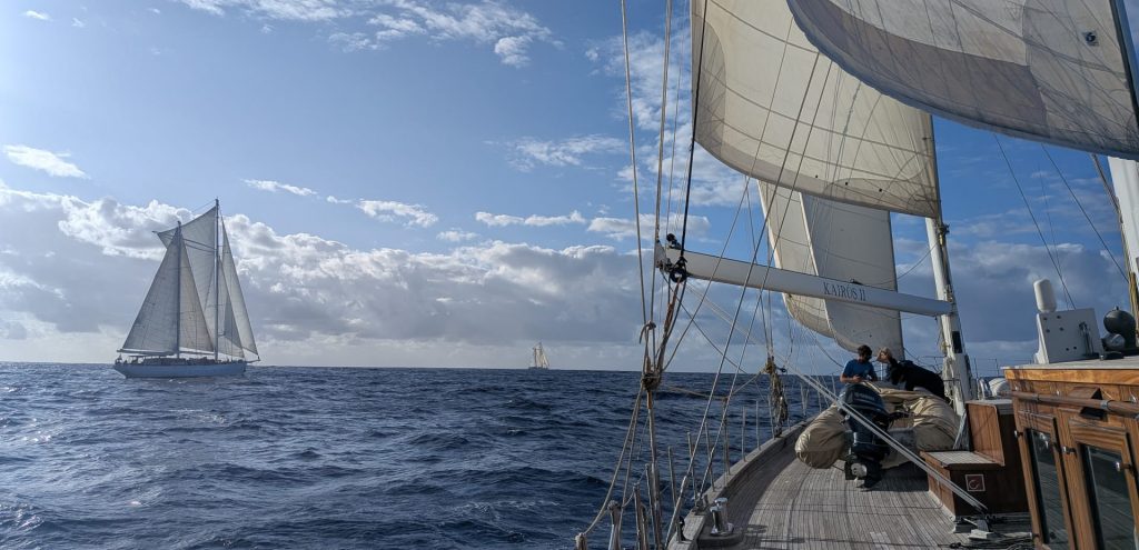 After lunch, the excitement grew – today wasn’t just reunion day for the three sisters. It was history. For the first time ever, all three of our Sailing Classics ladies met each other out on the open Atlantic during their crossing. As the middle child of this nautical family – younger than Kairos, older than Rhea – we waited for the elder to draw near and guided the little one along.